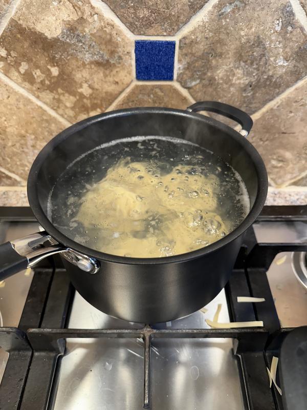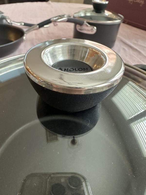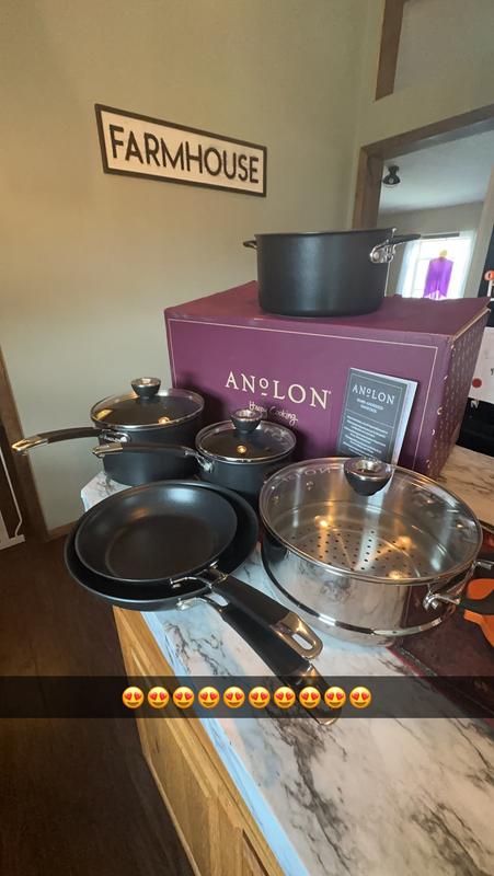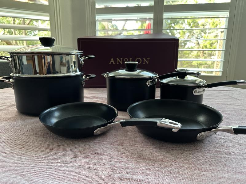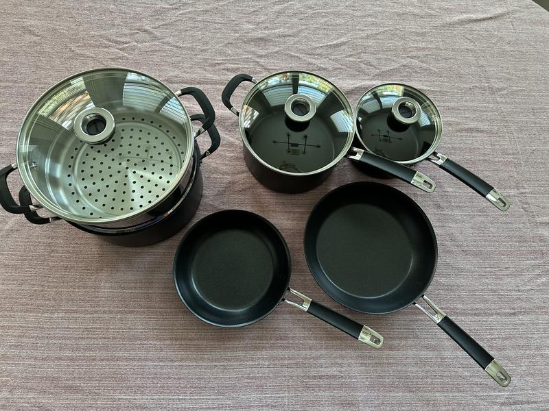 I vowed not to buy Analon again because not dishwasher safe and hot handles. Had my set almost 18 years. This set was on sale so I bought. Stacks nicely, no need to spray for stickin, quality much improved, handles have rubber protection. The heartbreak is no spaghetti strainer. Steamer yes. Maybe design has changed. Hones on the bottom only none in the sides. So totally bummed but I’m enjoying this purchase
