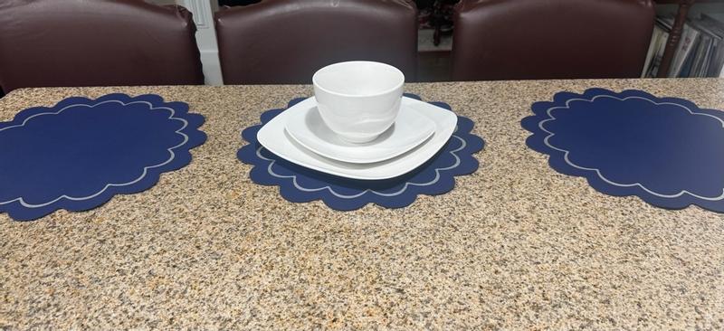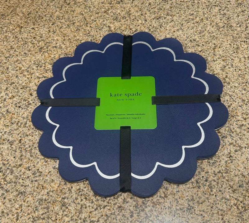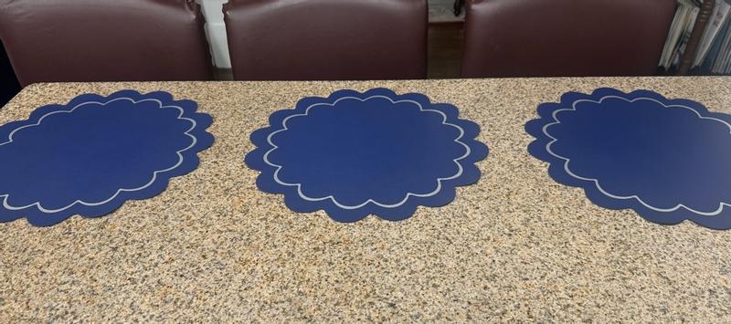 Kate Spade has once again delivered a delightful addition to home decor with their Scalloped Round vegan leather reversible Placemats. The first thing that caught my eye was the stunning color combination. The rich blue paired with the elegant silver print adds a sophisticated touch to my dining table. One of my favorite aspects is how easy they are to clean. Spills and messes wipe away effortlessly. These placemats are a perfect blend of style and practicality. Very well made and waterproof. I can highly recommend them.