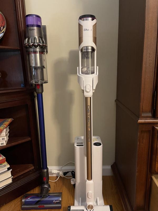 I decided to buy this on a whim, and while I am so glad that I gave it a try, I have to say that it appears that the vacuum itself is too short for someone of my height (5'10") to use. I have attached a photo of it on it's stand with my Dyson V11 standing upright beside it in an attempt to show the height difference. I must say the shark was so short that I could barely push it along the carpet; I kept lifting it up off the floor instead. I did not actually like the detect mode for the edges of the room, as I found it irritating that the suction was adjusted upwards to clean the edge of the room. This product left beautiful lines in the carpet and it did an OK job on hard floors too. I have some very light rugs that my Dyson V11 cannot clean (as it will try to suck them up) and this shark did a great job of fluffing those rugs back up. This is not a proper cyclonic vacuum cleaner. IF one is to open it up one can see that there is just a pleated HEPA filter behind the cone shaped shroud that is inside the bin. This does lead me to be concerned that the machine would lose suction very fast. The contents of the vacuum stick straight to the shroud. I had thought this vacuum would be cyclonic when I purchased it, hence why I am mentioning this. I found the self-emptying base cleared most of the dust off the filter, but not all of it. Furthermore, The self-emptying base is not cyclonic either, and you will have to stick your hand in there to clean some of the dust off when you do eventually empty it. It is a great idea that I think could use some fine tuning. Overall, the product was good, but I found that I personally could not overlook its faults, so I sent it back and I am still using my Dyson V11. I am not a stranger to Shark products as I used to be a house cleaner. 9 times out of 10 I would recommend the Shark corded vacuum to people as Shark products are normally excellent. I have even gifted a corded shark to my mother as she enjoys that it is much lighter than a corded Dyson. I myself continue to use Dyson in my own home due to the fact that I will only use a cordless vacuum for myself. This is not my first time buying a Shark cordless either; last time was a Vertex (I believe) and I also found that one was too short. This is something I would really like to see improved, possibly by an adjustable length tube, so that I can use a Shark cordless vacuum, instead of continuing to pay Dyson's prices.